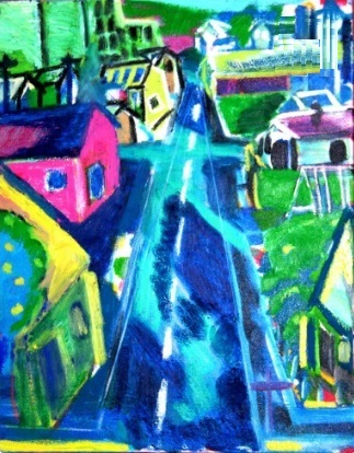 have the recruiting apparatus it now possesses. Living in Portland, Quenton pursued his passion for art and the result has been a journey embraced by self exploration. The resulting expressions Quenton has fixed upon canvas throughout the years include some reflections of the environment that shaped his perspective. His piece 4th and Fremont St. Looking North depicts his old neighborhood. The Flour Mill can be seen in the image. The grassy park with the swings is shown. The pink church building. Such images are old memories Quinton is sharing with us.